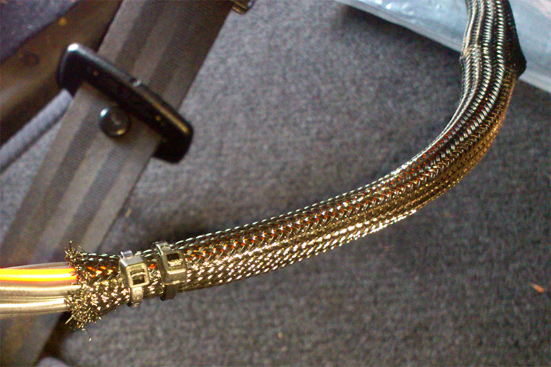 W celu dodatkowej ochrony kabli oraz ich grupowania zastosowałem oplot, który (tak mi się przynajmniej wydaje) dodatkowo wpłynął na poprawę estetyki całości. Przy stosowaniu oplotu należy pamiętać, że bardzo łatwo "rozsypuje" się on na końcach, dlatego warto tuż po ucięciu zabezpieczyć końcówki przez podgrzanie (hotairem, zapalniczką, opalarką itd.). Po naciągnięciu na kabel, oplot należy zabezpieczyć opaską, a jeszcze lepiej - koszulką termokurczliwą, co już wygląda profesjonalnie ;)